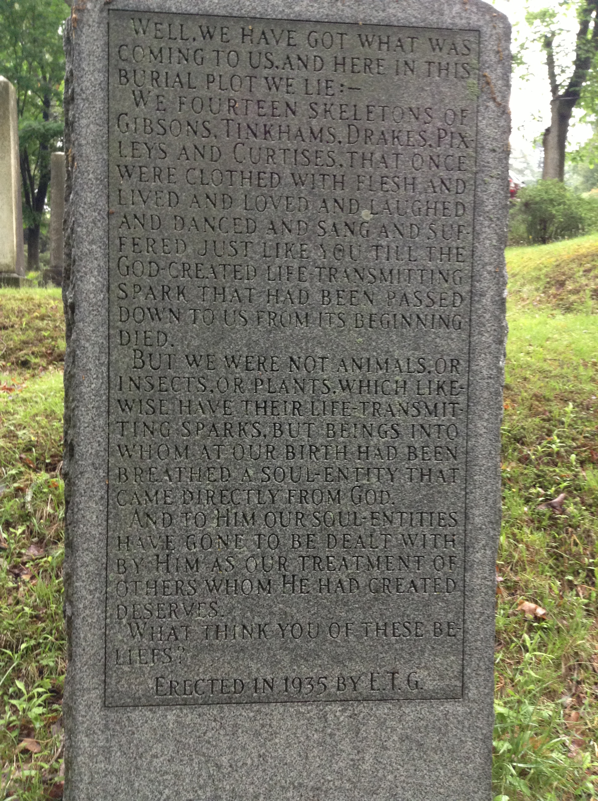 Along side one of the drives and down a few steep steps was a large headstone. On it was the epitaph I will share with you. I’ve heard (but cannot verify) that it is one of the longest epitaphs in America. The very length of the wording makes it difficult to photograph in a way this stone deserves. It was a multi-family marker. The grave sites of those mentioned at the bottom of the stone are scattered around a fairly large plot. I often wondered who these people were. Where did they live? Was I friends of one of the descendants?