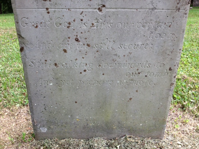 It was a damp and warm day in mid-August. I stood over the gravesite and heard the locusts singing in the nearby fields. The stone was smooth, given its age and I had to drop to my knees to read the delicate epitaph on the lower half of the headstone.