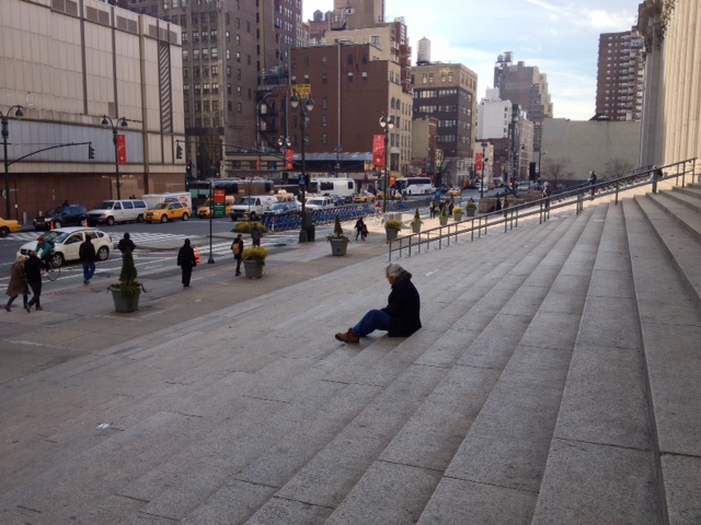 I stand inside the heavy brass doors looking out onto Eight Avenue. I notice that the steps are empty of people. A few strollers walk the avenue. Something catches my eye. There is a couple standing together on the bottom step. Someone is taking their photograph with an older camera…it’s not a digital model. I can see that from behind the door. The photographer is holding the camera up to their eye and peering through an eyepiece. Not often done these days.