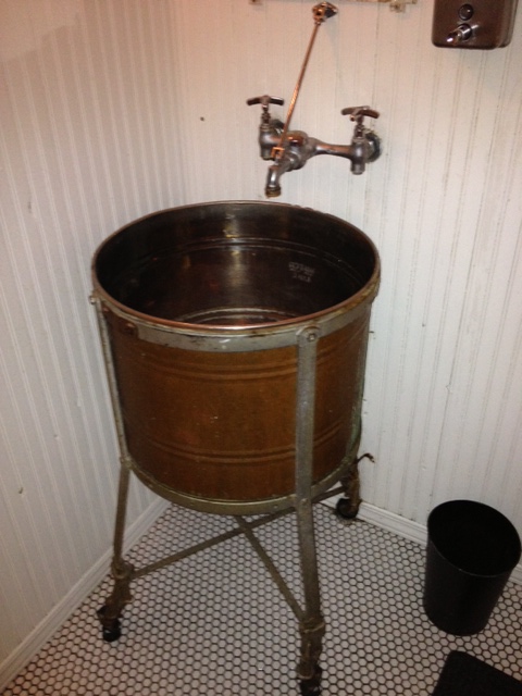 So, I went downstairs in search of water in the closet. After searching behind some doors, some woman screamed something at me in French after I opened one. How was I to know Femmes had something to do with women? My, the Canadians can be so suspicious. I finally found the source of the water. Now, I’ve been in not just a few Gents rooms in NYC and many other cities, but nearly all had some kind of copper or porcelain sink. Not here, at this 5-star establishment. This is what I found: