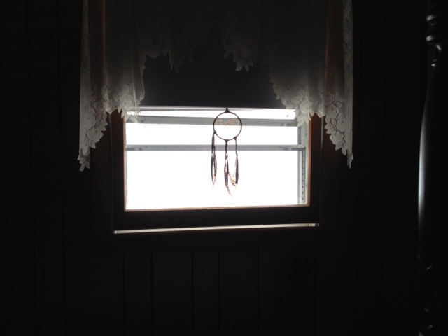 At this point in the post, I know most of you don’t believe me so I took a picture from our bedroom looking out at the view. See the lovely lace curtains? See the cool dream-catcher? See the white/grey view through the window? That’s snow. That’s all we can see.