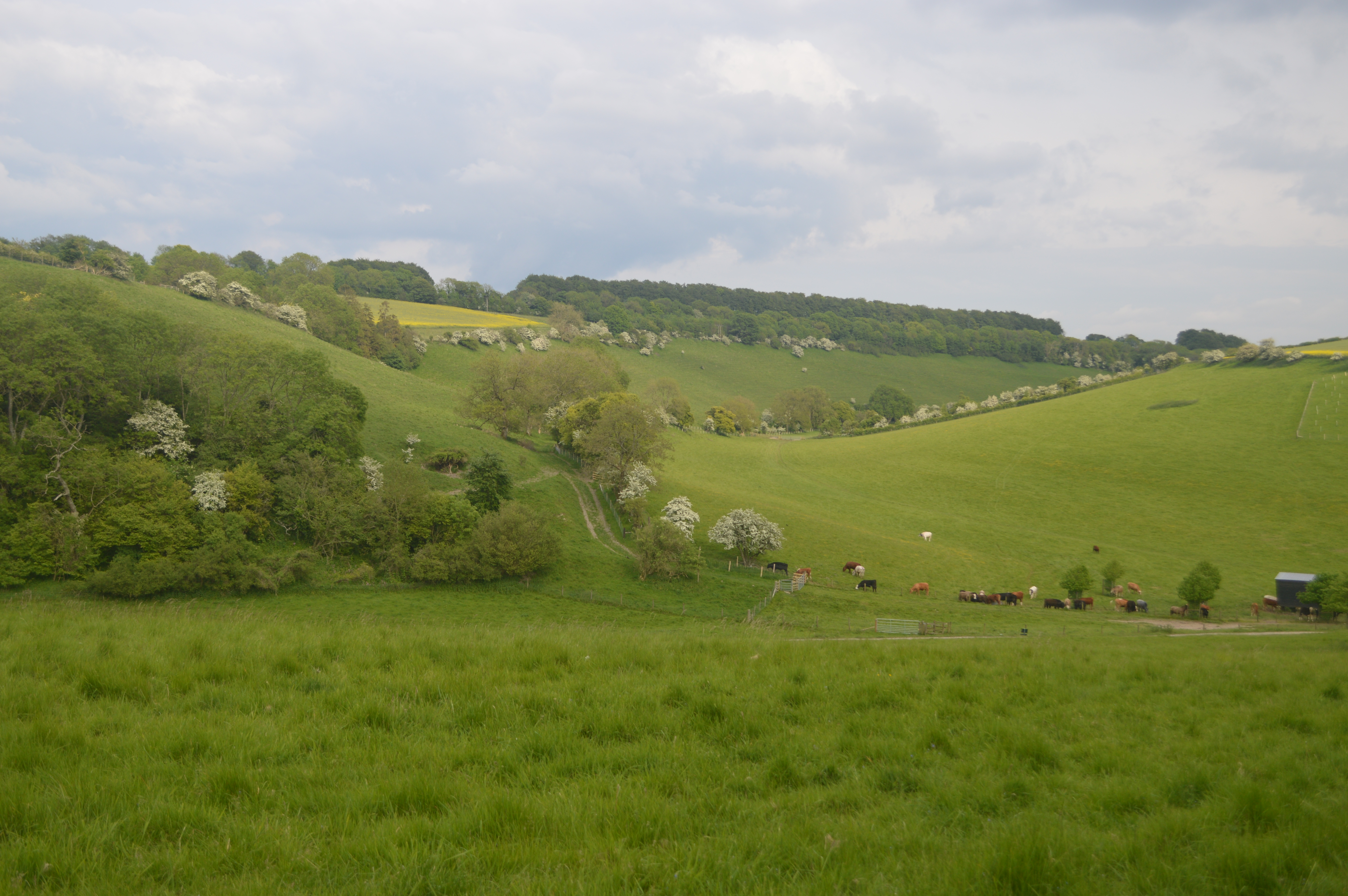 The guidebook mentioned going through several “kissing gates” but they were nowhere to be found. I noticed new fencing along the pastures. Again, the guidebook failed us. We took the wrong turn, sort of, and began a long slog to the top of the hill where the car park was located. The walk was said to be 4.5 miles, but I calculated that we did over 5 miles by the time we saw the adorable little Fiat sitting near a pasture and near a small but growing herd of cows. I hoped they didn’t think I was there to milk them. But they looked at me with those big, vacant bovine eyes. I recalled my grandmother’s cow and the name she gave it. I said: “Not now, Nellie.”
