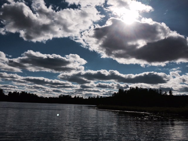 So, I turned my boat around and paddled for a few minutes. I had not taken my usual small lightweight kayak (the electric blue one with the white trim). No, I chose an older Old Town that was bright red. It had a larger cockpit so I could put my knees up and stretch a little more. I pushed forward and put my feet on the deck, resting on the PFD that I kept under the bungee cords in front of the cockpit. I put my head back. I watched the scattered cumulus clouds drift slowly beneath a deep blue sky. A slight breeze blew at my back. I took out my book but was unable to read two lines. Back into the nylon bag it went. I pulled my raspberry hat over my eyes and closed them. The boat gently rocked in the small waves. The breeze was causing me to drift in the general direction of our home. No other boats were on this part of Rainbow Lake.