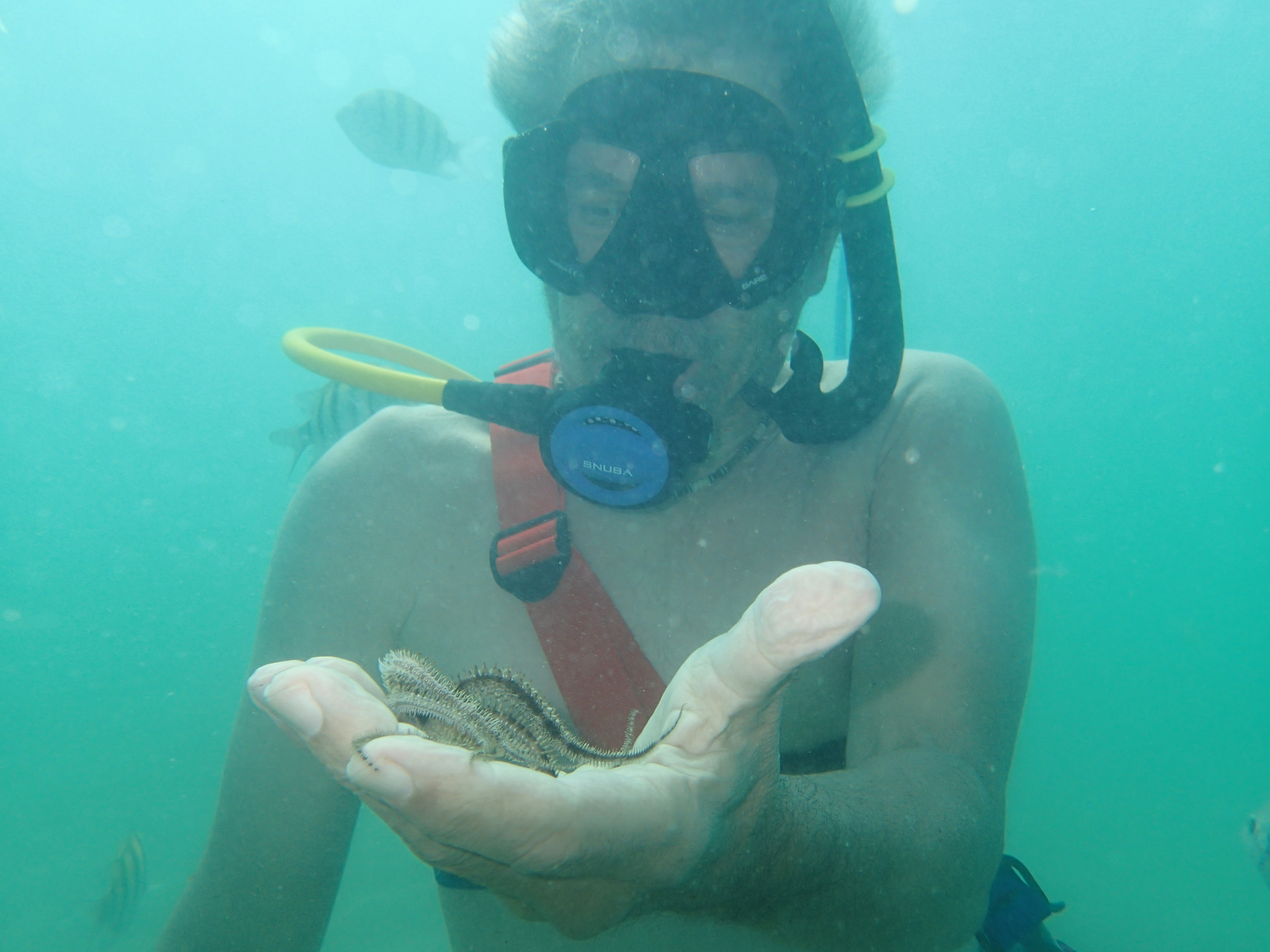 Terrance, the instructor, hands me a spider-like sea star. It crawls over my hand and then drops off to scurry along the bottom. There’s a flounder. Or maybe it’s just shifting sand? No, I see a flat fish with two eyes on the same side of the body (how that happens is another story).