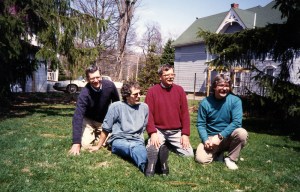 I grew up in Owego, New York. We were blessed with a large back-yard. There were enormous evergreen trees just beyond the lawn where my swing set was located. In between those two tall coniferous trees was a small Birch. Its trunk was only a few inches in diameter. One day, my father rounded up his four sons. He had us sit in front of the Birch tree. I’m on the right and look impish. Is that a sling-shot in my back pocket?