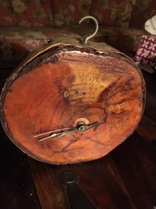 Six months later, my father presented me with the piece of the tree. He had cut open one side and inserted a clock mechanism. On the other side, he attached the hands of a clock. He glued the hour numbers and attached a hook.