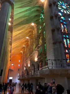 When I entered the Basilica, the interior was something I may have dreamt about in another lifetime. I’ve been in dozens of English Cathedrals and Anglican churches. I’ve been in Russian Orthodox churches and the great mosques of Istanbul. Many hours have been spent in Notre Dame in Paris. I don’t mention these things to boast–only to put things into some kind of perspective. Nothing prepared me for the sights inside the Sagrada Familia. My eye had too many places to look. The neck had too many angles to cover. The colors, the fluid shapes…the uneven nave, the Christ, hanging above the Altar.