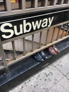 A few years ago, I found myself strolling east on 35th Street in Manhattan, across the street from this hotel. I noticed two pairs of men’s shoes (rather spiffy, I must say) neatly placed near a subway entrance. I took a photo and put it out on Instagram. [See the above]