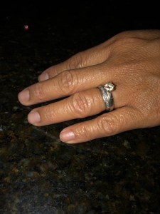 We each had a story about our wedding rings. My story was probably the least interesting so I’ll start with me. I wore my wedding ring for many years, removing it only for activities like kayaking and picking up hot babes in cheap bars (that was a joke). Kayaking tends to cause my ring to rub against my finger. But, for the last several years I’ve not worn my ring. I began to lose weight and in the dry air of the North Country, my skin shrinks. I performed a simple scientific test. I shook my left hand several times onto the sheets of our bed. The ring slipped off. Not a good thing so I put it on Mariam’s jewelry tray where it sat until I decided it was time for action. I needed to take the ring to a jeweler and have something put inside to hold the skin of my third finger. This is what I got: