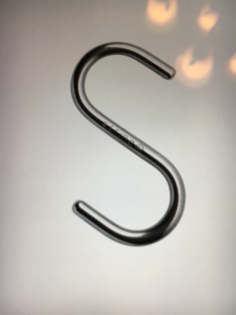 So I went to the hardware store and bought several ‘S’ hooks. Now these are harder than they look, so I tried to alter the shape with my fingers. I immediately cut a bit of my forefinger and thumb off.