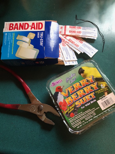 My wife suggested using a twist-tie. A twist-tie, I thought, could easily be chewed by a large woodpecker. No, I thought, that won’t do.