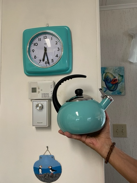 For my money, Aquamarine is the only color to add to your list. I can often be found sitting in my blue beach chair in our kitchen and sitting quietly admiring the tea kettle (Aquamarine) and our wall clock (Aquamarine). In the interest of Full Disclosure, the clock was purchased at Zabar’s in New York City, a tiny fact I can live with. The only snag in this set up is that I have to get up and move the chair every time Mariam goes into the bedroom or bathroom. But its a small inconvenience. Sometimes I bring my Blog Idea Book (which is brown and can be seen in the photo below).
