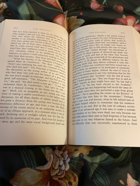 I am proud and somewhat amazed that I have only fifty pages left to complete this gargantuan task. At times the book can be like sucking fudge through a straw. The exquisite power of the language, the depth of the writing, the scope of the descriptions, the insights into love, death, grief, loneliness, lust, desire and dreams of men and women. I truly believe that if one calls him or herself a lover of books, then reading Proust is a must do action.