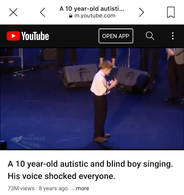 Several weeks ago I happened upon a collection of postings from America’s Got Talent. It was here that I first heard a pre-pubescent yodeler from Iowa or a darkly frightful young woman illusionist from Indonesia. But I paused on a segment featuring a ten year old autistic boy (who is also blind!). His foster father held his hand and did the introduction while the boy rocked back and forth, holding his cane. His name is Christopher Duffley. The clip is eight years old but I had never seen it before. The dad said the boy would be singing “I Want To See You“. I googled the song and found a tune by that name written and preformed by Boz Scaggs. I’m not totally certain it’s the same song…but it’s a moot point. The point is that I was very moved by what I was watching. The boy’s first faltering notes. His unease apparent.