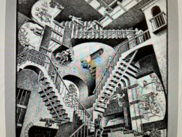 Upon closer inspection I was astonished to see that it was only a painting of a nail. My tension eased. Besides, the Security Guard, whose name tag read: Richard, was chatting up the red-head Security Guard from Gallery 201, (name tag read: Amber. He was making headway.) I stood back. This was something else indeed. I walked back the first room and read the writing on the wall. Whoa. This was Trompe l’Oeil. I scratched through my fanny pack for my French Phrase Book. It meant the eye deceives. Suddenly, a memory flashed before me. I remember a poster I had back in the early ’70’s. It was M. C. Escher, perhaps one of the most famous graphic artists in a long time. It was all coming back to me…