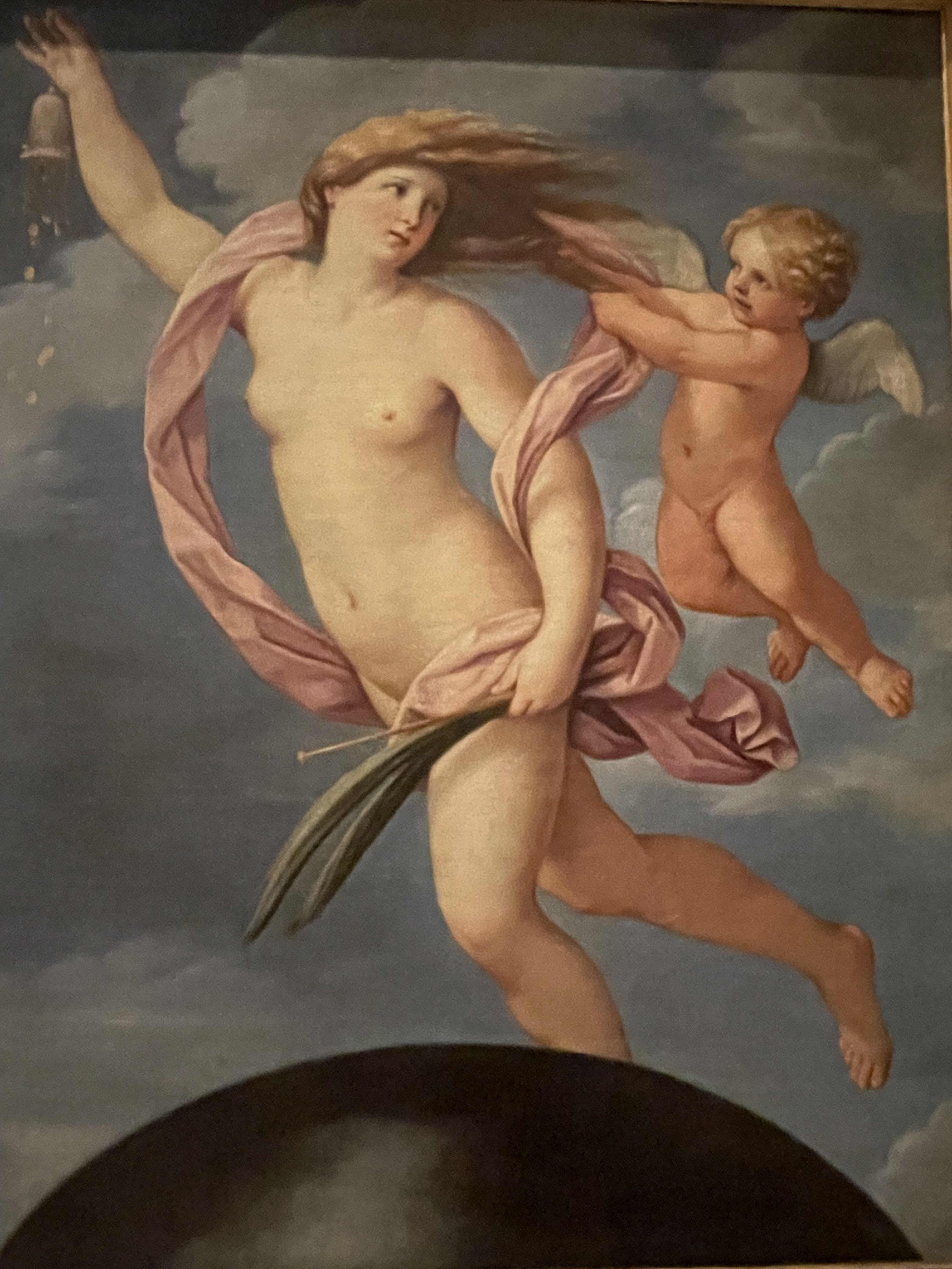 [In a gallery leading to the Sistine Chapel. Title: “Fortuna restrained by Cupid” by Scoula di Guido Reni. Photo is mine,]