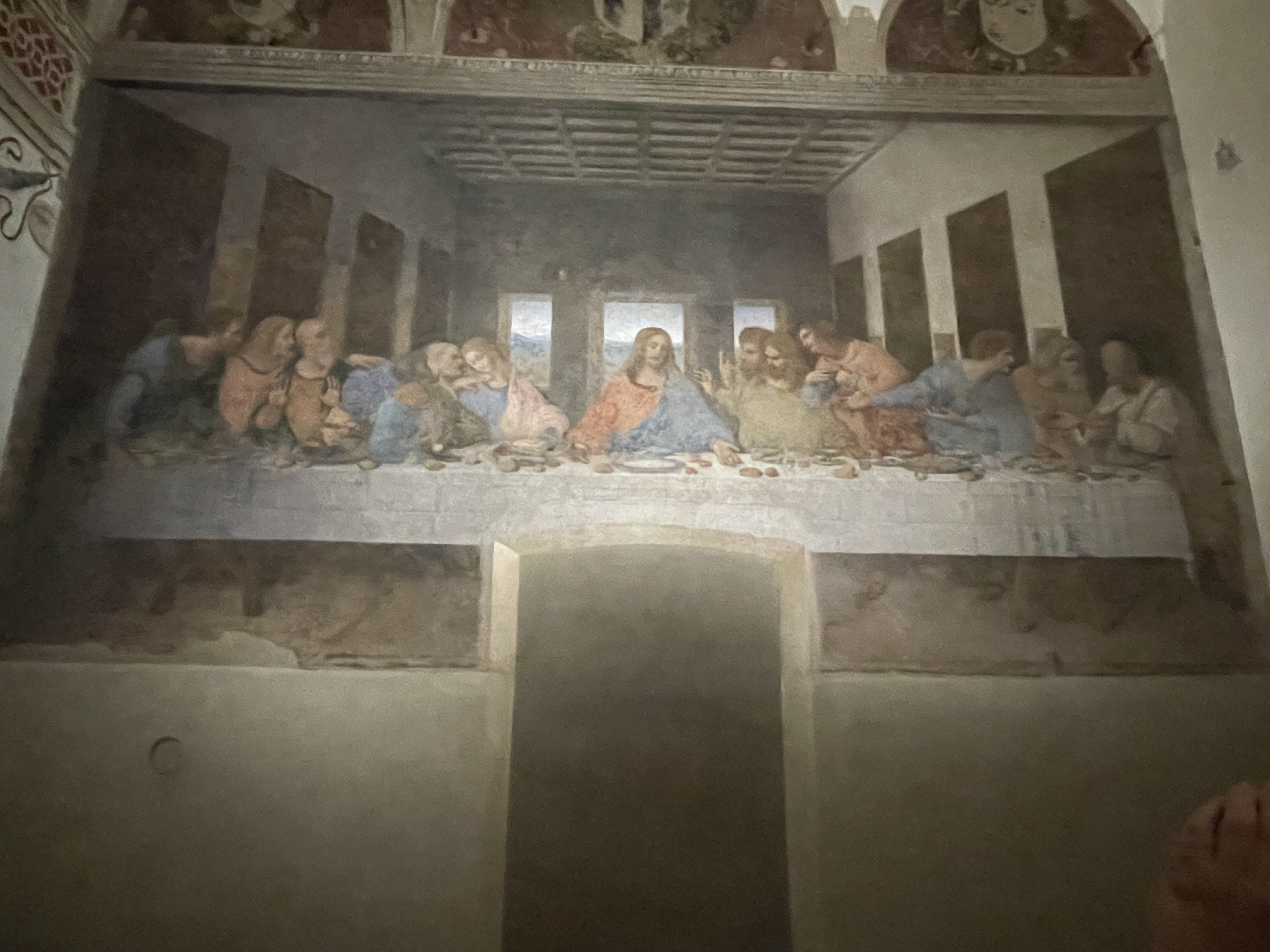 We made two visits to Milan. The first lasted three nights. We wanted to explore the city but more importantly, Mariam was determined to see Da Vinci’s “Last Supper” which has been undergoing restoration for many years. (Leonardo had made a bad decision on how to apply certain pigments which he wanted to adhere to the plaster wall. It failed. The masterpiece began degrading within a few years.) It continued to decline in quality for several centuries (and even survived the bombing of WW II.) Now it has been restored as much as modern techniques will allow. I knew about the painting in a superficial way. But our tour guide pointed out aspects the Master used…and they took my breath away.