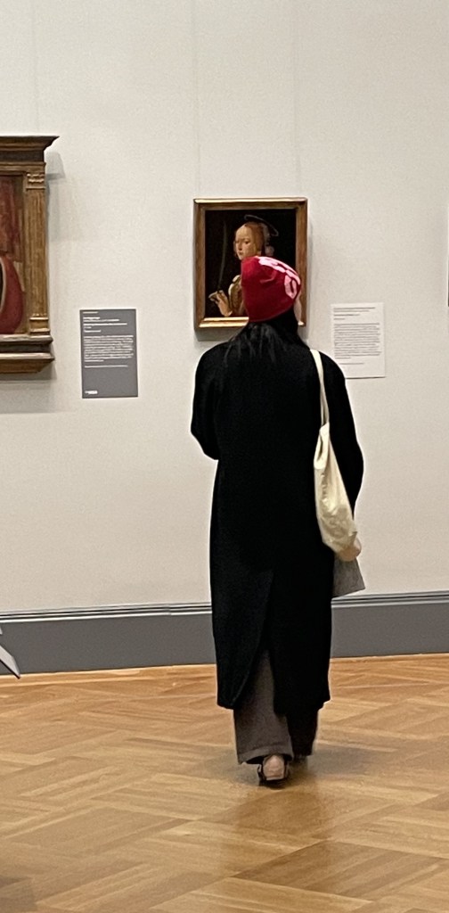 Just before the final door that would be our exit, our way back to the real world of a chilly February evening and taxis, buses, and people. But, did I want to lose this moment? I snapped a quick photo of her contemplating a Vermeer-like woman, in oil, on a 20″ x 30″ canvas.