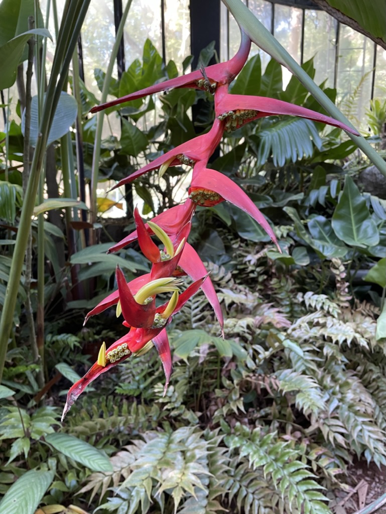 [Inside the greenhouse. I. didn’t think such a flower existed on earth. Venus perhaps, but not here. After a moment, however, I knew what it was. Heliconia metallica The Shining Bird of Paradise. Photo is mine]