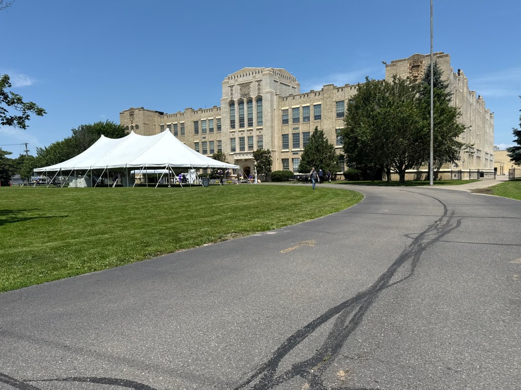 People are lining the sidewalk. Family. Friends. Cheering and yelling congratulations to each student with a cap and gown.