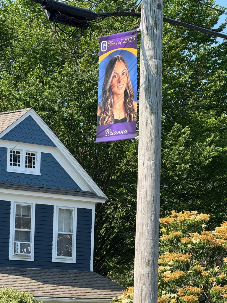 [Utility poles along Front Street leading to the Greenport School. The graduates are honored by their photos flapping in the breeze. Photo is mine.]