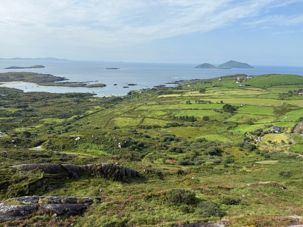 [Nearing the tip of the Ring of Kerry. Off in the distance, somewhere, is Skellig Michael, a small island with a 6th century monastery. It’s unclear to me whether the two islands to the right are those islands. Photo is mine.]