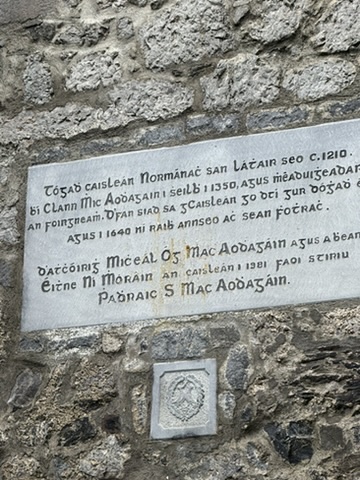 [The plaque above the main entrance to the castle. The bottom line? That’s my name in Gaelic. Photo is mine.]