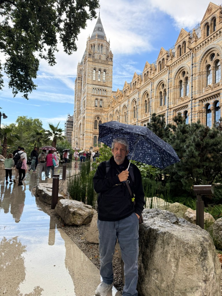 [Standing in the English rain, waiting for the sun. The author standing near the entrance of the Natural History Museum, London. Photo taken by Mariam Voutsis.]