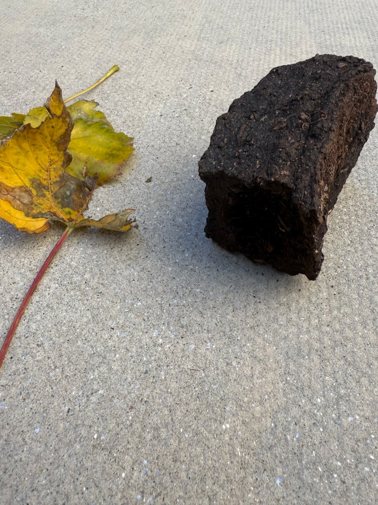 [On my carpet in NYC. A leaf and the clod of peat I brought back from Ireland. Why the leaf? My way of illustrating where the peat comes from. Organic matter. Like a leaf. Photo is mine.]
