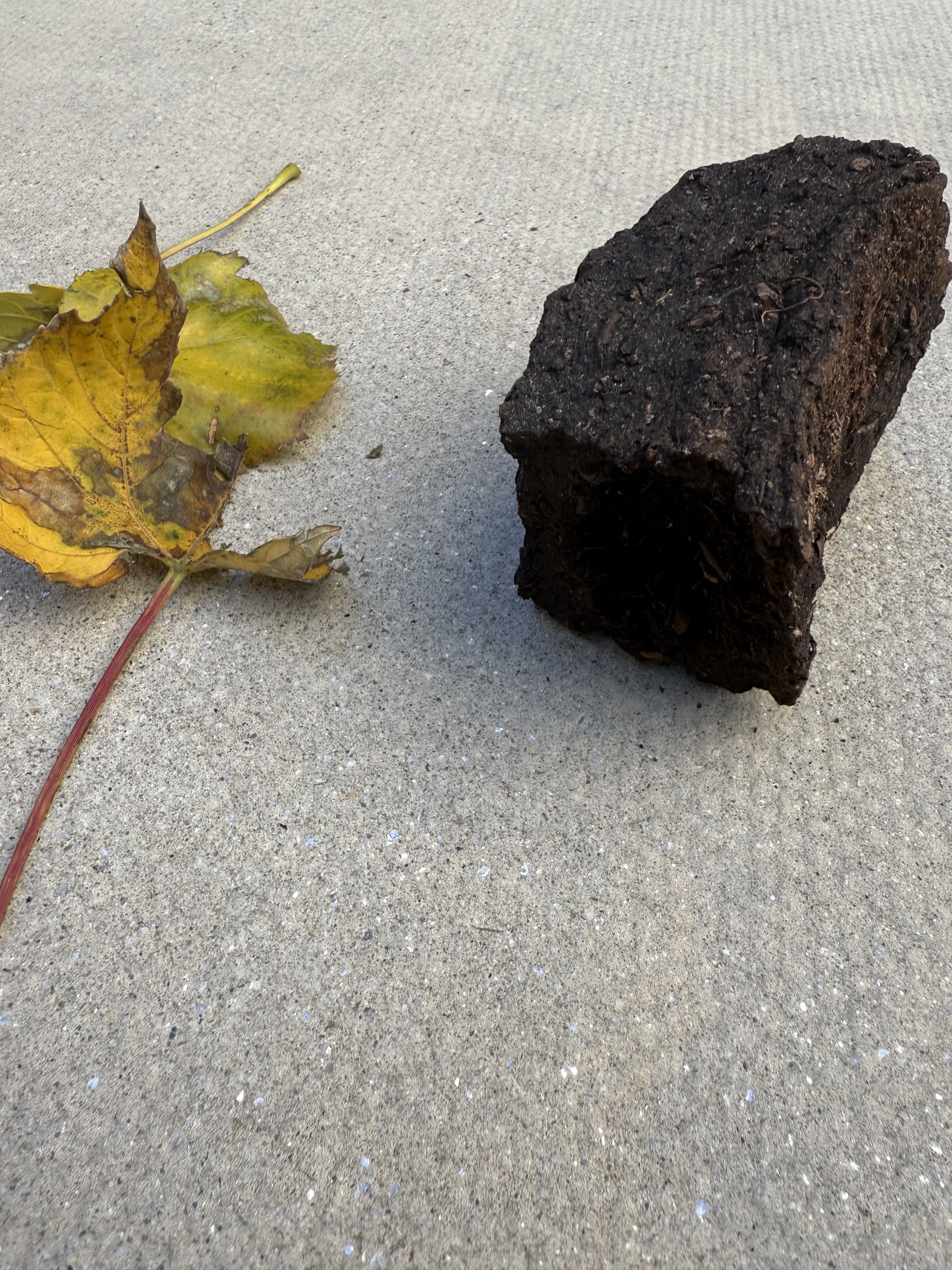 [On my carpet in NYC. A leaf and the clod of peat I brought back from Ireland. Why the leaf? My way of illustrating where the peat comes from. Organic matter. Like a leaf. Photo is mine.]